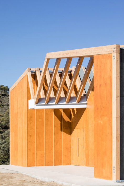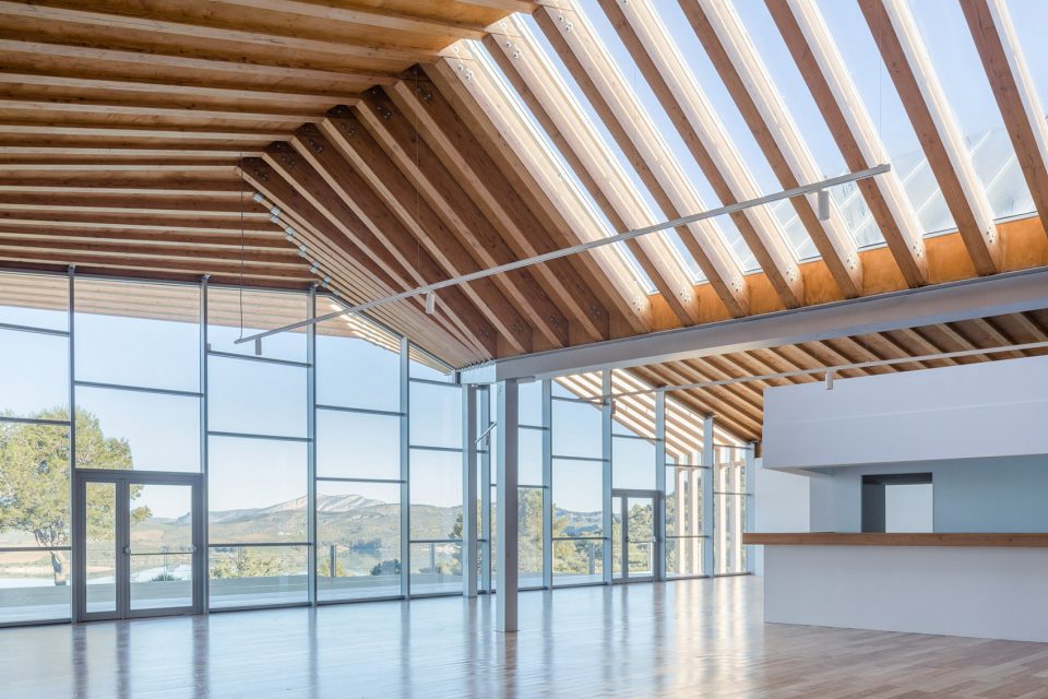 平行布置的木質(zhì)外框架形成了該建筑的主要特征,頂部的扭曲打破了嚴(yán)謹(jǐn)又富有秩序性的建筑外觀,創(chuàng)造了視覺的沖擊。外立面木結(jié)構(gòu)的夾縫間由木板加以防水涂層覆蓋,而末端縫隙則采用石板覆蓋。這種設(shè)計(jì)方式暗喻了峽谷的形成和對(duì)古道的解讀。建筑依靠光電板實(shí)現(xiàn)全部能源自給自足,并依靠Canadian well實(shí)現(xiàn)室內(nèi)通風(fēng)。