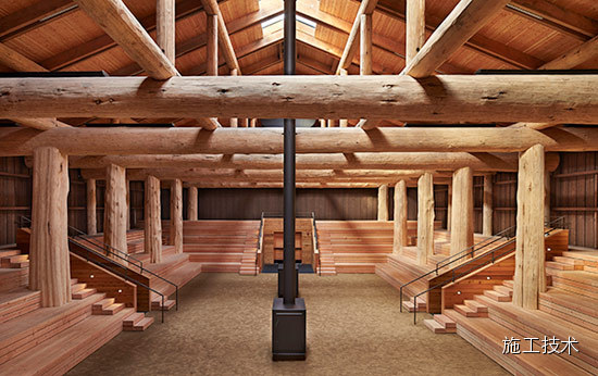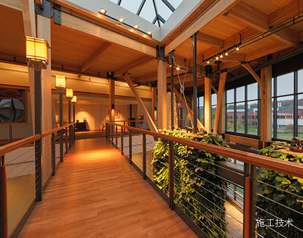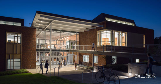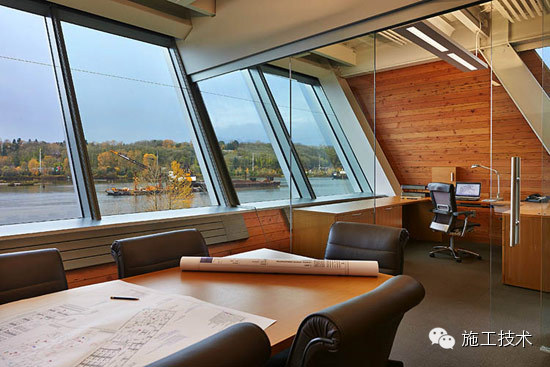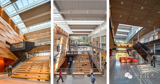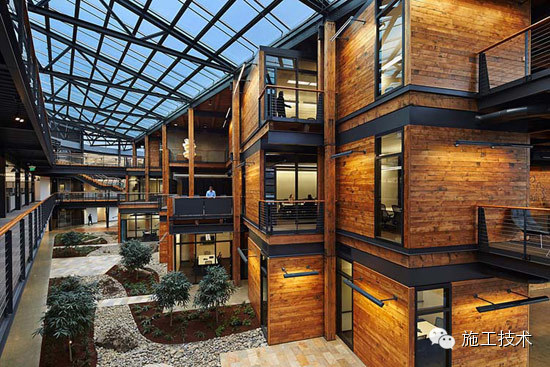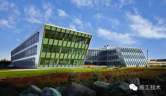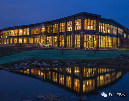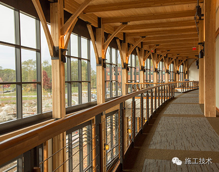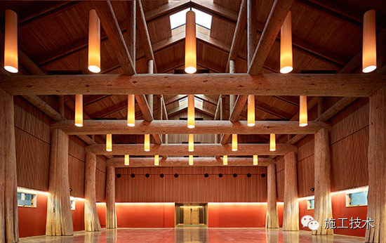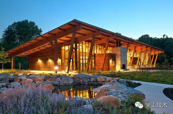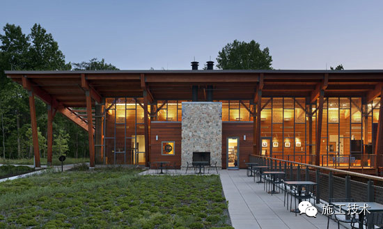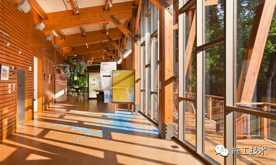 建筑物的桁架為膠合層壓板,從而優(yōu)化了這種可再生資源的結(jié)構(gòu)價(jià)值。膠合板消耗能源少于鋼筋混凝土或鋼材,可用于更長的時(shí)間跨度,可承受重負(fù)荷,并且擁有復(fù)雜 的形狀。該建筑通過了LEED環(huán)境保護(hù)認(rèn)證,包括一套可再生的膠合板結(jié)構(gòu)系、節(jié)水管道夾具、利用可回收的當(dāng)?shù)夭牧稀⑹覂?nèi)擁有豐富的自然光線以及高效的機(jī)械 系統(tǒng)、照明和外表皮。