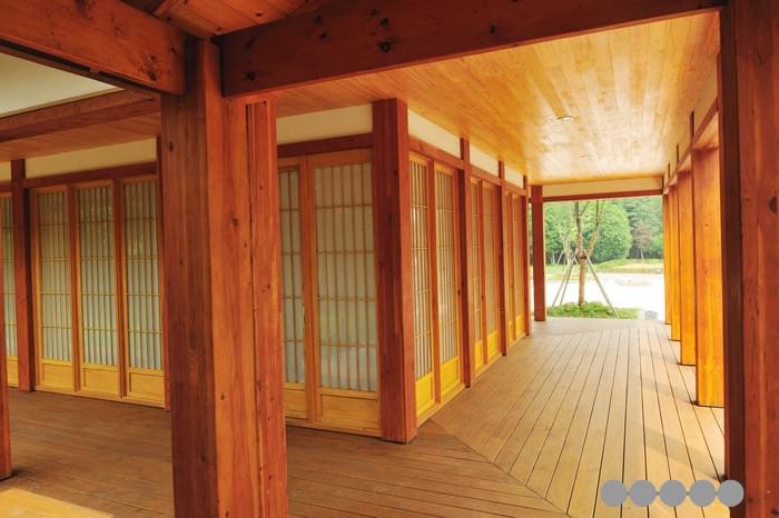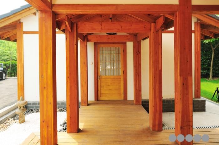 百花園日式木建筑四周有日式的圍廊和陽臺,但采用的是花旗松膠合主柱和鐵杉防腐木地板。一樓和二樓均采用了大面積的和式移動門窗,裝飾以日本進口的幛子紙,透光而不透視,而所有日式門窗均采用溫潤細膩、耐腐抗變形的加拿大黃柏。循花旗松實木樓梯拾級而上,是日式茶室、辦公會客室、休息室和秘書室等功能區(qū)劃。整個室內裝飾以針葉材實木板條和流白為主,地面是十分日本式的青石板,頂部的日式燈具均用直紋的花旗松實木在工廠定制而成。