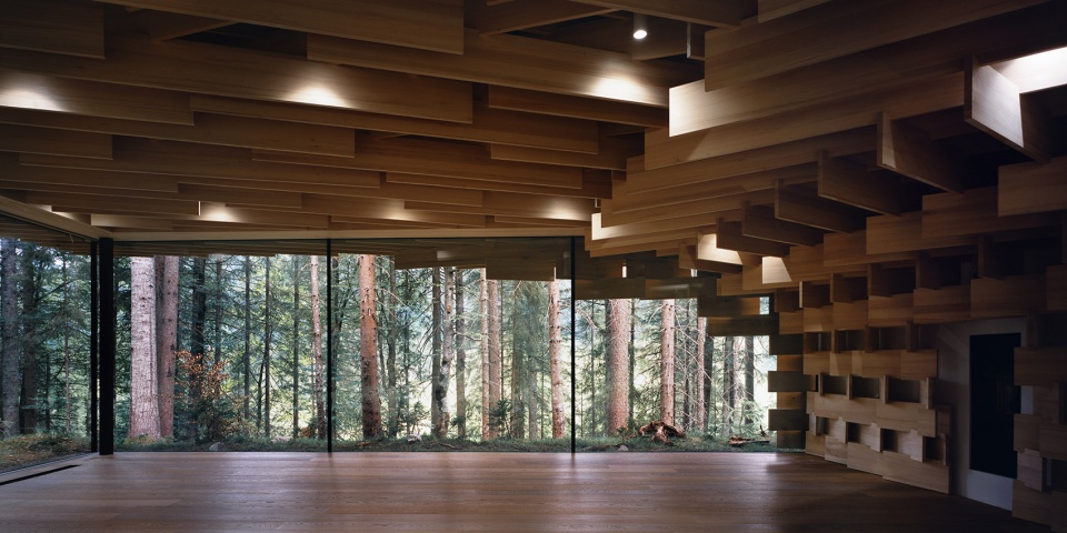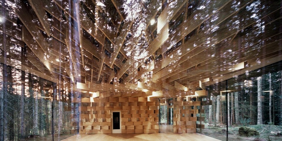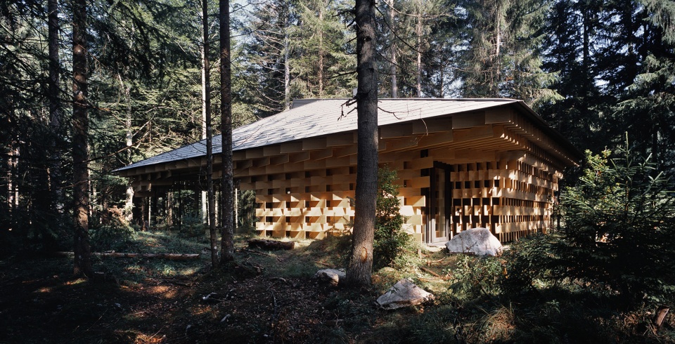 該建筑以生長在場地附近的冷杉樹為主要材料,3厘米寬的木板像樹枝一樣堆疊起來,在廣闊的森林和精致的建筑間形成一種柔和的過渡。小屋同樣也充當(dāng)了使人融入森林的媒介。陽光透過枝葉間的縫隙從天窗透進室內(nèi),帶來森林中常??梢泽w驗到的“komorebi”(木漏れ日)般的效果。