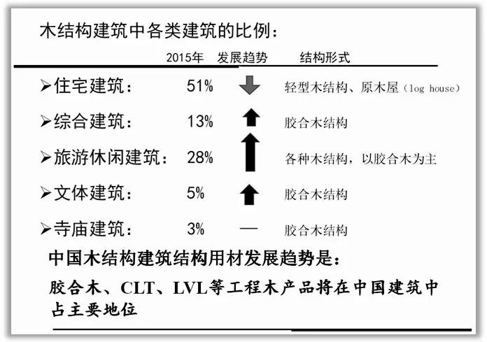 幾十年來(lái),磚混結(jié)構(gòu)已廣泛應(yīng)用于我們的民用建筑中。施工成本低,給人以安全感,耐用性和低維護(hù)成本,而木結(jié)構(gòu)房屋不穩(wěn)定,不安全,易著火,易受害蟲(chóng)害。遇水分會(huì)導(dǎo)致腐爛和霉變,因此難以接受這種新的木結(jié)構(gòu)建筑。由于對(duì)現(xiàn)代木結(jié)構(gòu)的理解不足,因而產(chǎn)生這些疑問(wèn)是正常的。只要在成本,安全,保護(hù),功能等方面采取適當(dāng)措施,通過(guò)大量的實(shí)驗(yàn)比較,專業(yè)知識(shí)的宣傳,樣板房的示范,特別是中國(guó)古代木結(jié)構(gòu)建筑和文化的影響,我相信人們的思想會(huì)發(fā)生變化,而木結(jié)構(gòu)建筑的生活體驗(yàn)也會(huì)影響人們的固有觀念?,F(xiàn)代木結(jié)構(gòu)完全可以被接受。下圖所示的各類木結(jié)構(gòu)建筑發(fā)展趨勢(shì)也能說(shuō)明這一點(diǎn)。