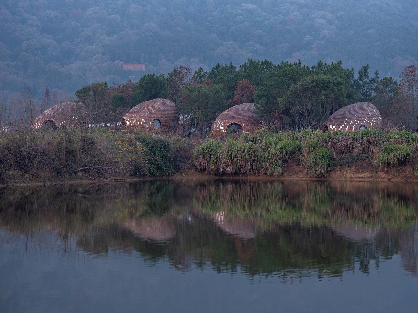 種子木屋整體呈橢球形,底部采用鏡面鋁板,往高處漸變?yōu)槟就摺gR面鋁板隨著季節(jié)、天氣的變化,反射周圍的環(huán)境和氛圍,冬季時是紅土地,春夏季時是綠植,潮濕時是氤氳霧氣,晴天時是明媚陽光。鏡面鋁板是種子屋落地生根的部分,上部的木瓦則使建筑逐漸回歸自然柔和的本質(zhì)。