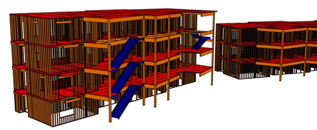 考慮到這些建筑物的墻體、形狀和輪廓都很復(fù)雜。設(shè)計(jì)時(shí)對(duì)每一面墻都進(jìn)行了建模,并將它們預(yù)制化,以便后期快速安裝。團(tuán)隊(duì)在電梯和出口樓梯處還使用了 DLT 豎井壁,這樣可以實(shí)現(xiàn)極快的安裝,同時(shí)還可以顯露木材。