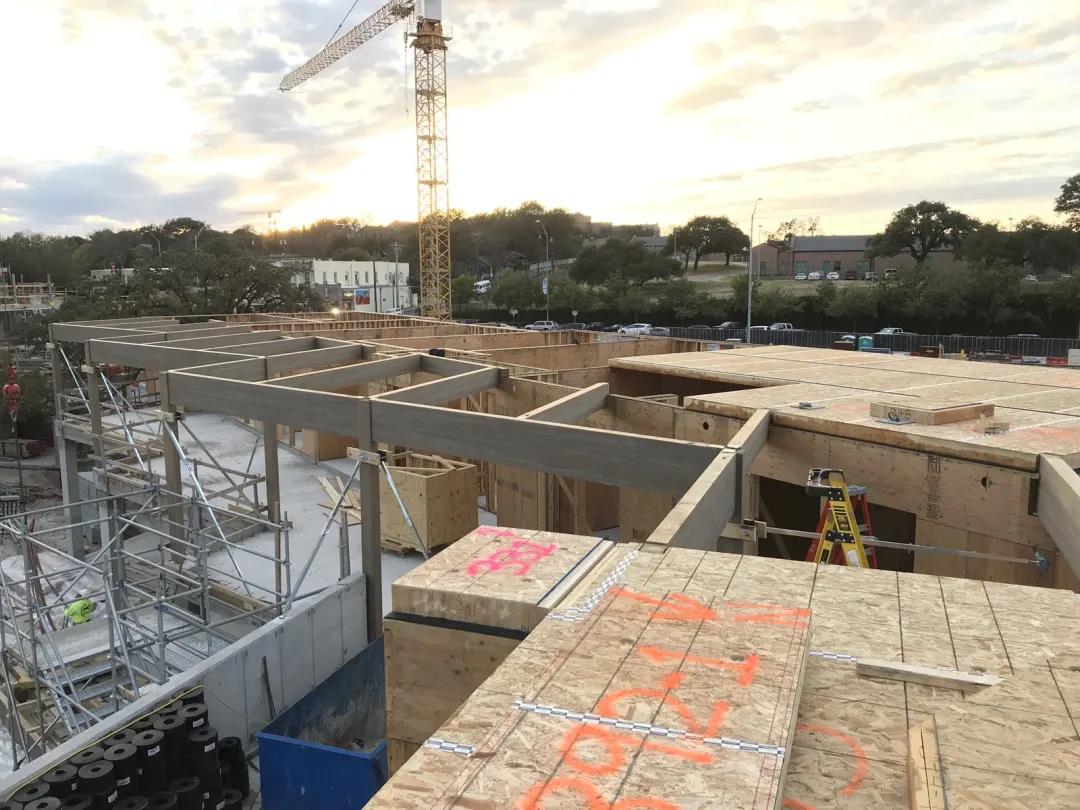 聲學(xué)設(shè)計(jì)也是早期設(shè)計(jì)階段的一個(gè)關(guān)鍵考慮因素。為了滿(mǎn)足 STC/IIC 等級(jí),在 DLT 面板上放置了隔音墊以及鋪設(shè)了3 英寸的混凝土層。為了打造良好的居住環(huán)境,設(shè)計(jì)團(tuán)隊(duì)為了減少側(cè)翼噪音,在立柱墻內(nèi)安裝了隔音條。