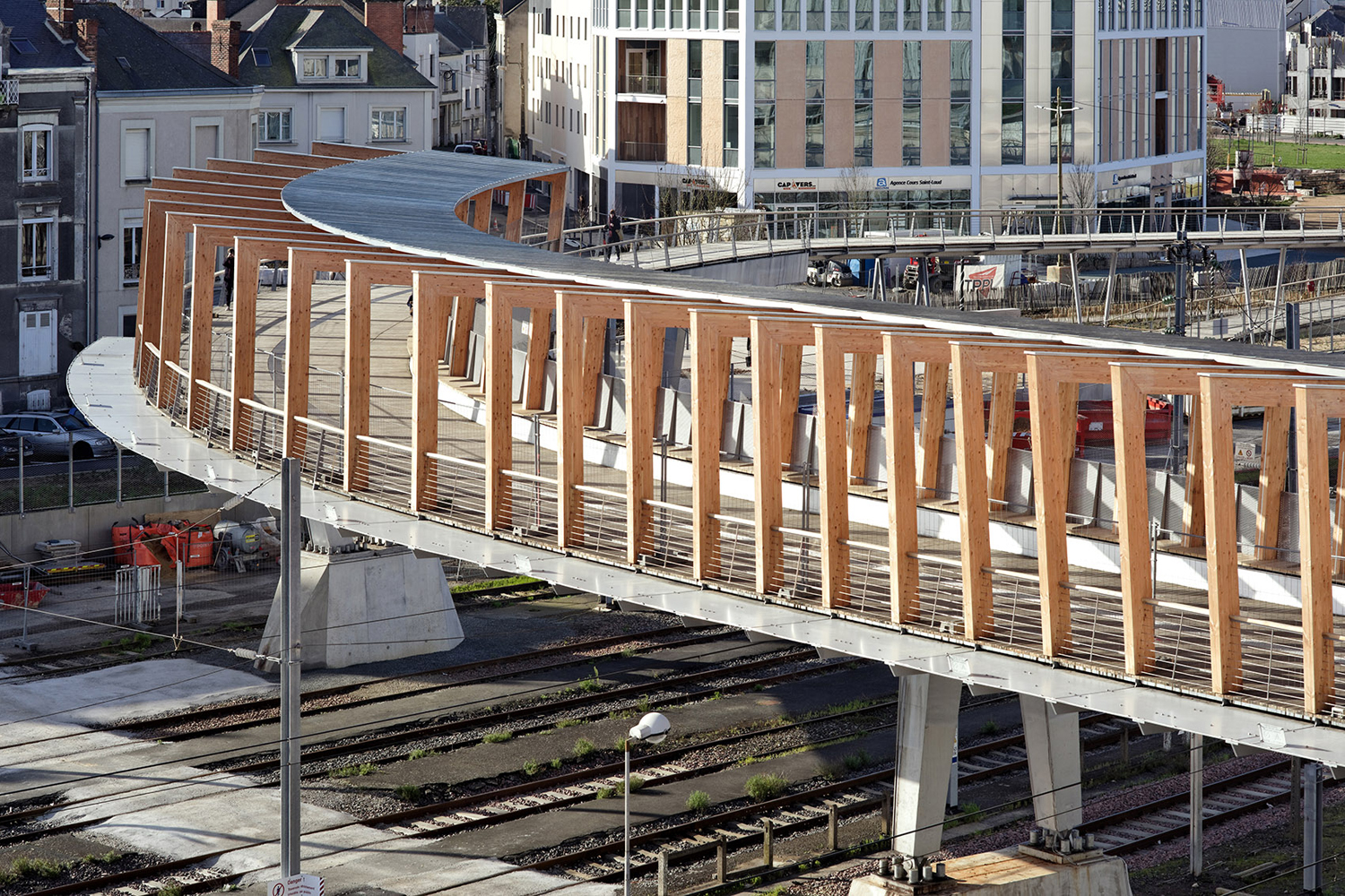 Dietmar Feichtinger建筑事務(wù)所在昂熱Saint-Laud火車站設(shè)計(jì)了一座新的橋梁,供行人和自行車使用。橋梁呈柔軟的弧線形,跨越總寬度達(dá)70米的一道道鐵軌,融入到城市的地形之中。橋面由中空箱體和鋼架組成,弧線西側(cè)整合有木制長椅。項(xiàng)目整體優(yōu)雅而輕盈,將不同地區(qū)連接在一起。由膠合木梁組層面的框架支撐屋頂和照明系統(tǒng),呈現(xiàn)出驚人的效果,使橋梁成為一個(gè)吸睛的新地標(biāo)。橋的剖面不斷變化,形成動(dòng)態(tài)的空間,讓人們?cè)谶M(jìn)入、爬上樓梯、漫步、等待、坐下休息、觀看和離開等行為狀態(tài)下體會(huì)到不同的空間特點(diǎn)。項(xiàng)目為一個(gè)單體結(jié)構(gòu),尺度與所在區(qū)域相呼應(yīng),施工精美,提升了人們對(duì)該區(qū)域的關(guān)注度?;⌒谓Y(jié)構(gòu)讓橋面可以緩慢抬升,連接新建的Place Giffard-Lagenvin散步道和另一側(cè)的公園。三臺(tái)電梯和樓梯在車站、酒店,以及開往巴黎和南特的火車站臺(tái)之間創(chuàng)造了無障礙連接,方便騎自行車的人使用。橋梁外形美觀,展現(xiàn)了改造后車站地區(qū)的新樣貌。