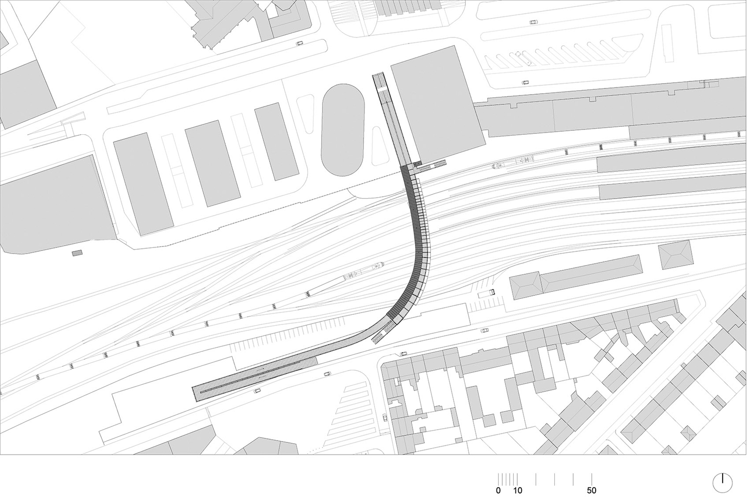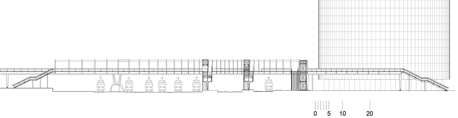 城市開發(fā)計(jì)劃對(duì)這片區(qū)域進(jìn)行升級(jí)。車站一側(cè)的Auguste Gaultier大道上已經(jīng)建造了一棟辦公樓和一座多層停車場(chǎng);另有一棟酒店正在施工。鐵軌南側(cè)的Fulton街上則將建設(shè)一條新的散步道。這座供行人和自行車使用的天橋是區(qū)域現(xiàn)代化的一部分,由獲得競(jìng)賽優(yōu)勝的Dietmar Feichtinger建筑事務(wù)所負(fù)責(zé)設(shè)計(jì)。他們的設(shè)計(jì)遵循城市尺度,跨越鐵軌形成的屏障,并且設(shè)置電梯和樓梯,幫助身體不便的人直接到達(dá)站臺(tái)。