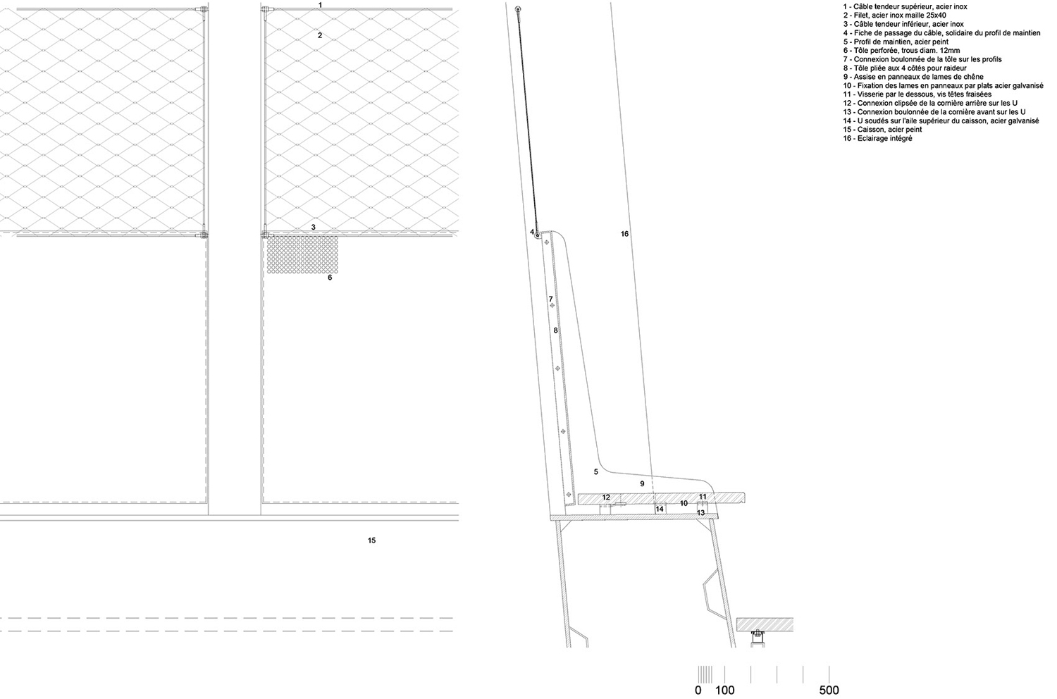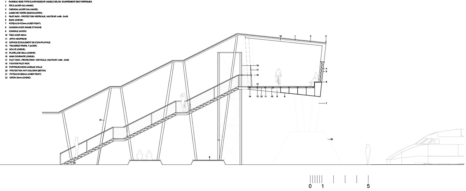木廊是橋梁中最具代表性的 元素。它們標(biāo)識(shí)了橋梁的入口和交匯處,與城市形成對(duì)話。同時(shí),它們打斷了人們?cè)跇蛏系穆贸?。木廊之間距離不同,結(jié)合橋體本身的弧度,創(chuàng)造了不斷變化的視野,讓人們可以一直從新的角度觀看鐵軌以及來去的車輛。越靠近橋梁中部,木廊越密,隱蔽的空間氛圍邀人停留;在橋梁的兩端,木廊之間的距離更大,提供更加廣闊的城市視野。建筑師對(duì)項(xiàng)目體量的考量包含對(duì)柱廊形狀的設(shè)計(jì),其傾斜的角度隨運(yùn)動(dòng)的節(jié)奏變化,截面在通往橋梁中部的過程中不斷擴(kuò)大。越來越開放的框架突顯了橋梁在鐵軌上方的重要性。