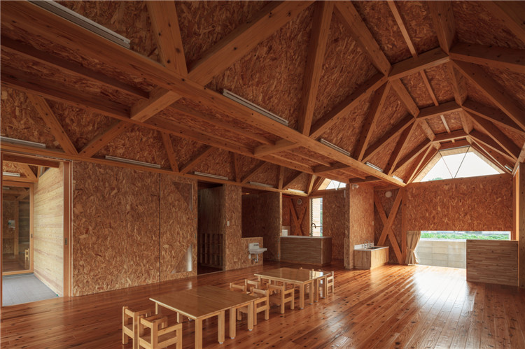 建筑的所有結(jié)構(gòu)不是天花板就是墻體,木桁架梁傾斜設(shè)置,是屋頂?shù)幕A(chǔ)結(jié)構(gòu)木構(gòu)件。這樣的設(shè)計(jì)滿足了客戶對(duì)于“保育室被木頭包圍”的要求,減少了建設(shè)成本。此外,通過降低天花板的高度,木材長度被縮短了,對(duì)空調(diào)的需求也降低了。由于天花板幾何形狀不規(guī)則且窗戶為梯形,因此雖然天花板最低的地方只有2.2m左右,但即使是成年人也不會(huì)感到壓抑。
