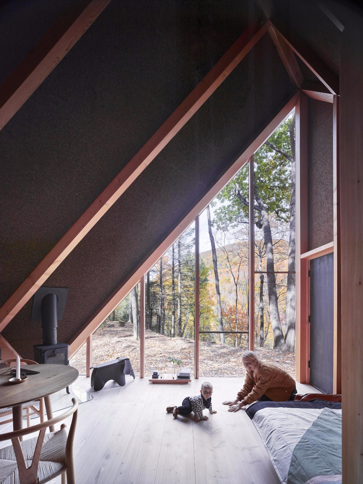 “該設(shè)計(jì)從傳統(tǒng)的A型住宅結(jié)構(gòu)演變而來(lái),以其傾斜的屋頂和傾斜的墻壁而聞名,這樣的形態(tài)建造簡(jiǎn)單同時(shí)有利于雨水的引流,”事務(wù)所補(bǔ)充道。“最終形成的這個(gè)晶體狀的房子使A45擁有一種不斷變化的外觀。”