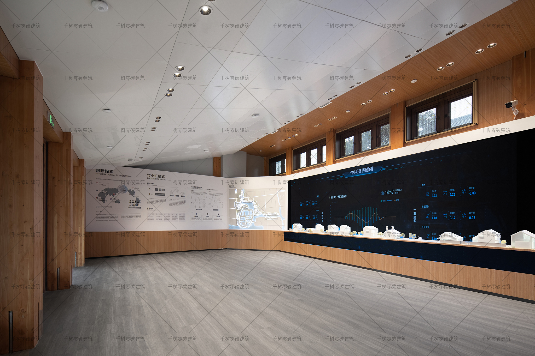 報告廳木屋和展示中心木屋墻面采用隔氣膜+內(nèi)外雙層保溫(內(nèi)保溫184mm厚,外保溫70mm厚)+CLT正交膠合木飾面板,屋面采用隔氣膜+保溫(屋面保溫235mm厚)+光伏瓦的圍護結(jié)構(gòu),門窗采用被動式節(jié)能阻燃木門窗(內(nèi)置遮陽百葉),加上高能效的技術(shù)設備:地源熱泵系統(tǒng)、風力發(fā)電系統(tǒng)、建筑光伏一體化系統(tǒng)、光儲直柔系統(tǒng)、熱回收系統(tǒng),通過可視化的智慧運維管理平臺高效監(jiān)管、智慧運算,綜合管控與整治,最終實現(xiàn)了零碳建筑的目標。