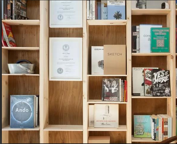 在內(nèi)部,設計師團隊需要利用每一寸可用的空間。垂直螺柱裸露在外,并作為支架支撐,以及由樺木膠合板制成的更大的水平表面的錨。