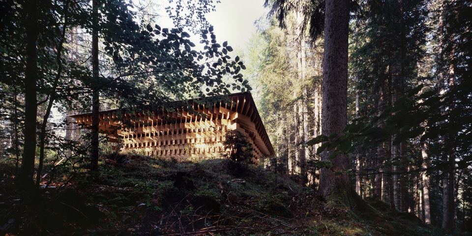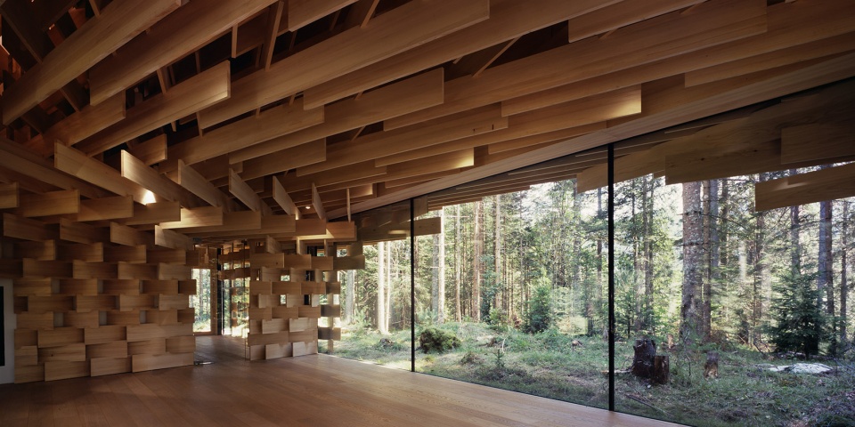 該建筑以生長(zhǎng)在場(chǎng)地附近的冷杉樹(shù)為主要材料,3厘米寬的木板像樹(shù)枝一樣堆疊起來(lái),在廣闊的森林和精致的建筑間形成一種柔和的過(guò)渡。小屋同樣也充當(dāng)了使人融入森林的媒介。陽(yáng)光透過(guò)枝葉間的縫隙從天窗透進(jìn)室內(nèi),帶來(lái)森林中常常可以體驗(yàn)到的“komorebi”(木漏れ日)般的效果。