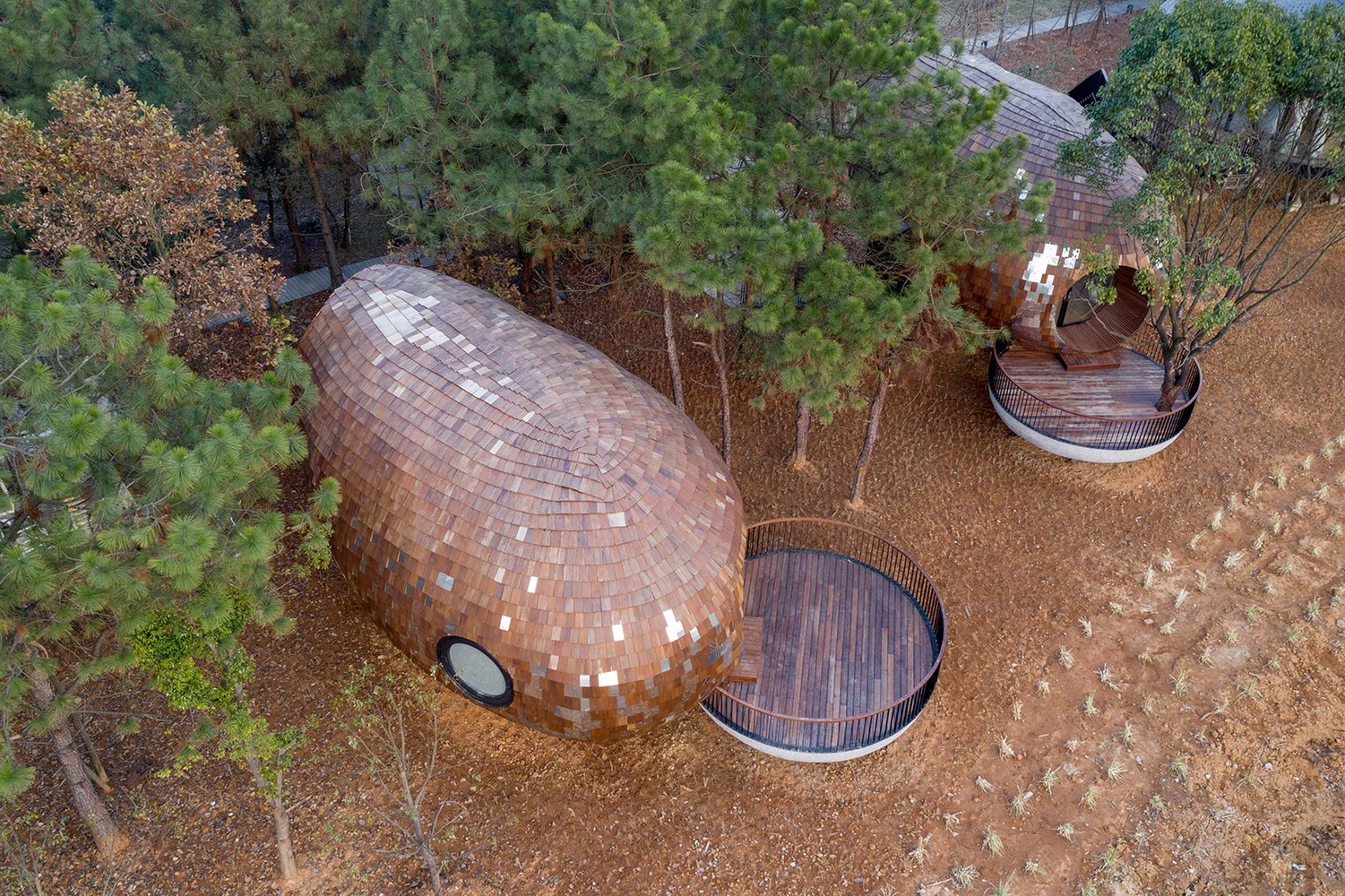 種子木屋整體呈橢球形,底部采用鏡面鋁板,往高處漸變?yōu)槟就?。鏡面鋁板隨著季節(jié)、天氣的變化,反射周圍的環(huán)境和氛圍,冬季時(shí)是紅土地,春夏季時(shí)是綠植,潮濕時(shí)是氤氳霧氣,晴天時(shí)是明媚陽光。鏡面鋁板是種子屋落地生根的部分,上部的木瓦則使建筑逐漸回歸自然柔和的本質(zhì)。