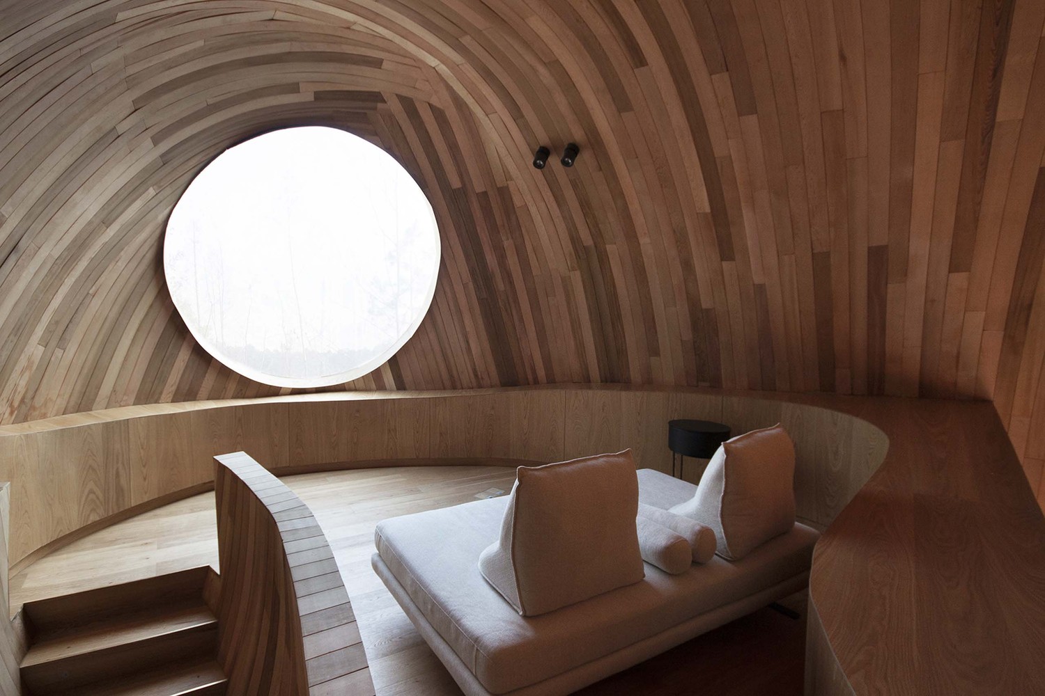 種子屋室內(nèi)墻面采用統(tǒng)一的木拼,自然的木色變化形成的條紋感,進(jìn)一步強(qiáng)調(diào)橢球形態(tài)的空間感。主臥后側(cè)體量容納入口、衛(wèi)浴、儲(chǔ)藏等功能區(qū),同時(shí)形成親子區(qū)閣樓。閣樓與一層通過一個(gè)插入式的橢圓柱型樓梯間連接,同時(shí)樓梯間與入口空間穿插,形成有趣的異形空間。