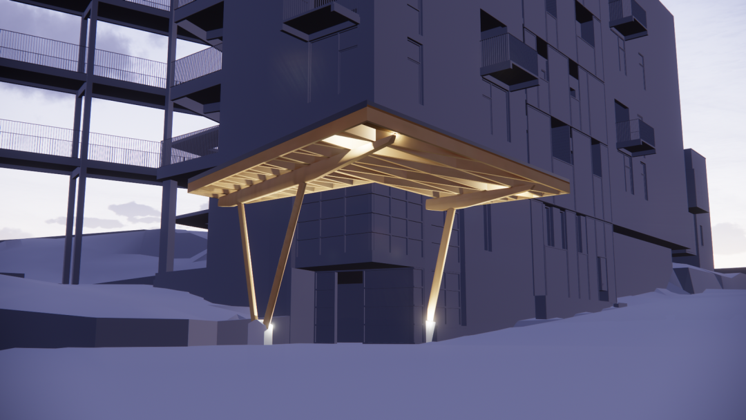 除此之外,還有其他幾處使用了定制的木結(jié)構(gòu)建筑構(gòu)件,其中包括 DLT 電梯和樓梯井、懸掛式陽臺、樓梯以及入口處的獨(dú)立門廊。