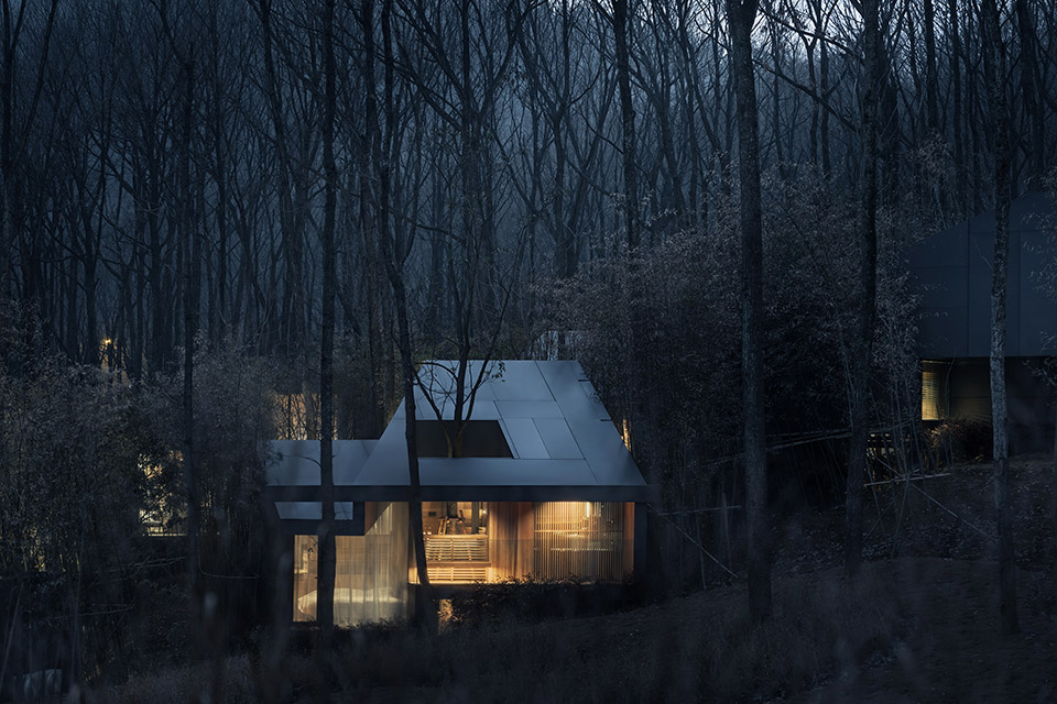 每個小屋中都保留了一棵場地原生的樹木,樹木所占據(jù)的空間成了屋中院,透過玻璃時刻于室內生活相伴,是自然向建筑的反向滲透,屋中院也為室內衛(wèi)生間提供了具有私密性的風景。